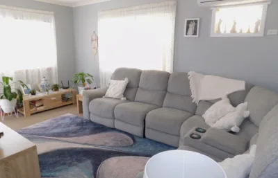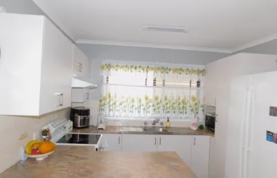 Inside, you’ll find an open plan layout with a spacious kitchen featuring modern benchtops and ample storage. Both bedrooms include built-in robes and are carpeted for comfort. The home also boasts reverse-cycle air conditioning, ceiling fans throughout, and a separate toilet for added practicality.