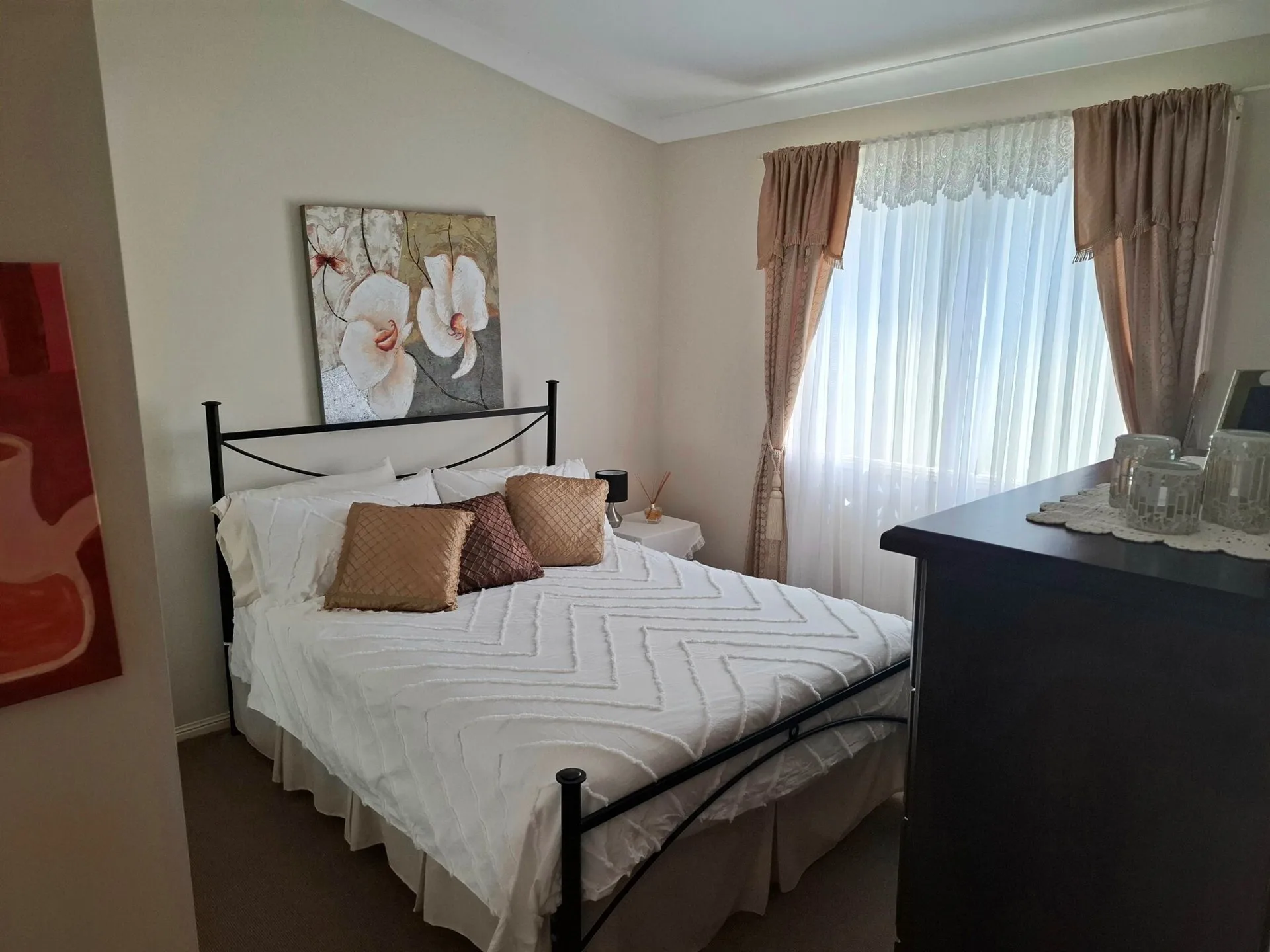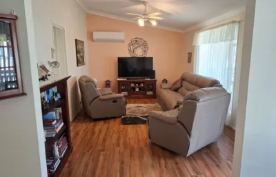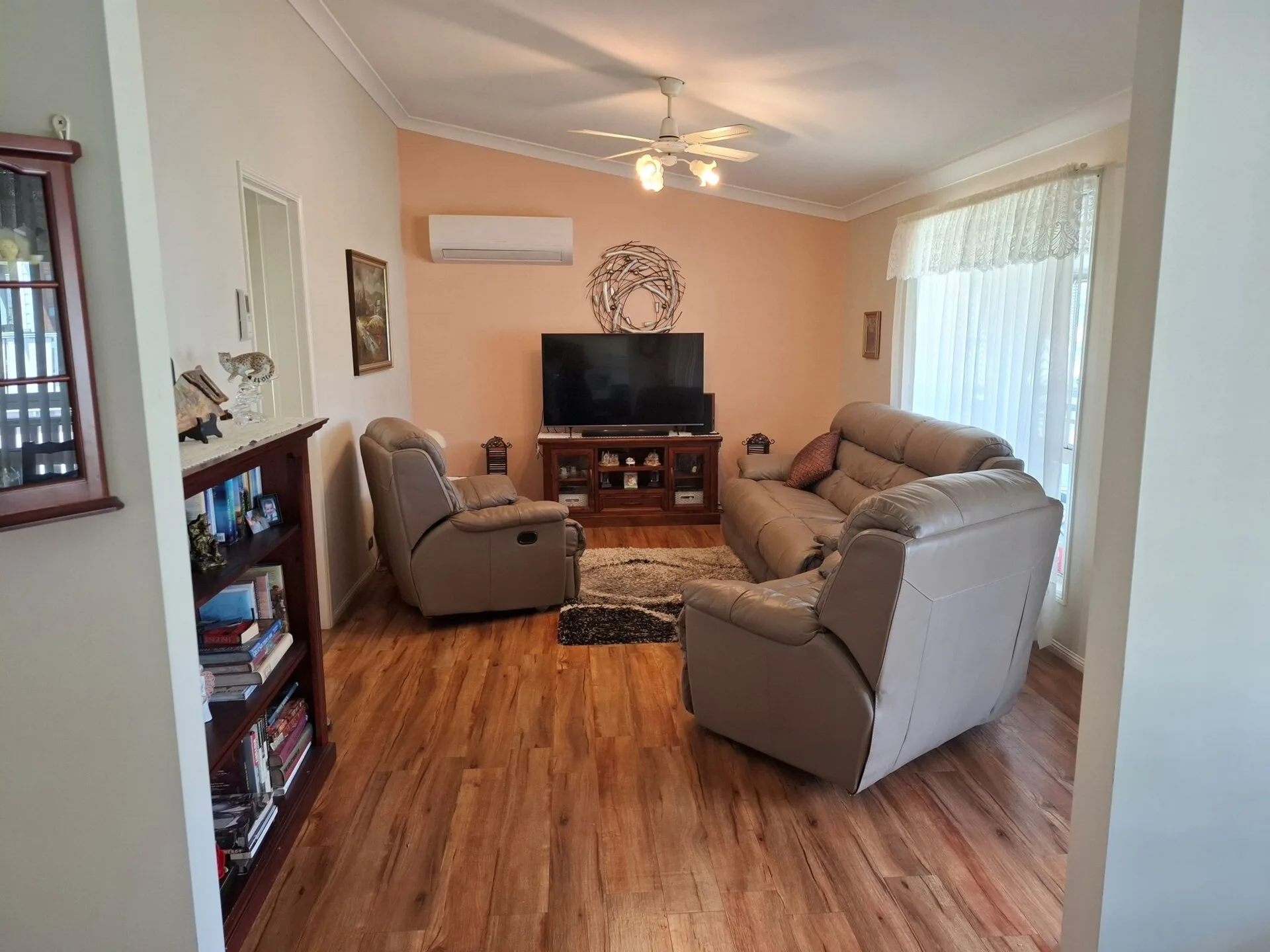 The two-way bathroom functions as an ensuite, and there’s a separate internal laundry for added convenience. Year-round comfort is assured with air conditioning and ceiling fans. Outside, there’s ramp access at the rear, a garden shed, water tank, and space for a furry friend to enjoy.