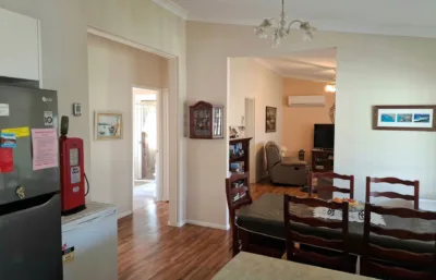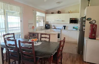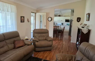 Step inside to enjoy the benefits of open-plan living with a full-sized kitchen, large pantry, and gas cooking. The adjoining dining area easily accommodates a full dining setting, ideal for hosting family or enjoying quiet meals at home. Timber flooring throughout the main living spaces adds warmth and character, while the carpeted bedrooms offer comfort and built-in robes for storage.