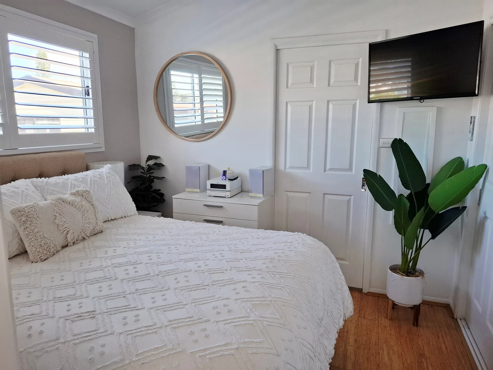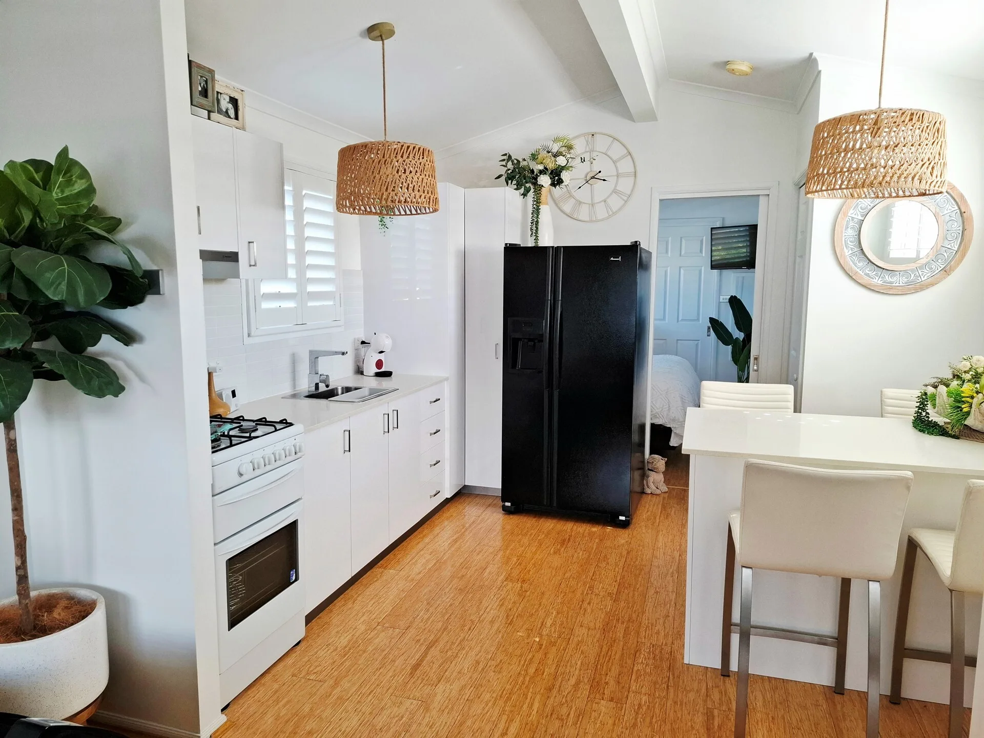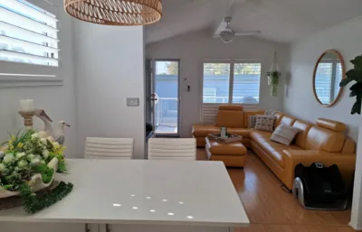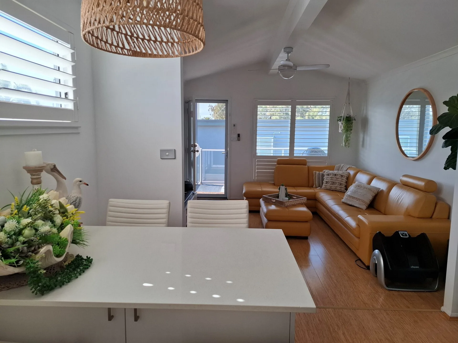 The spacious bedroom features built-in robes and its own air conditioning. Enjoy your morning cuppa or unwind in the included spa – there’s nothing left to do but move in and enjoy. Pets are welcome, and there’s a single car space plus marine carpeted under-house storage.
