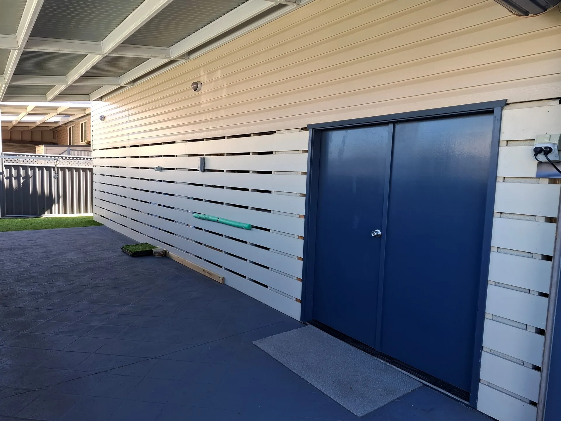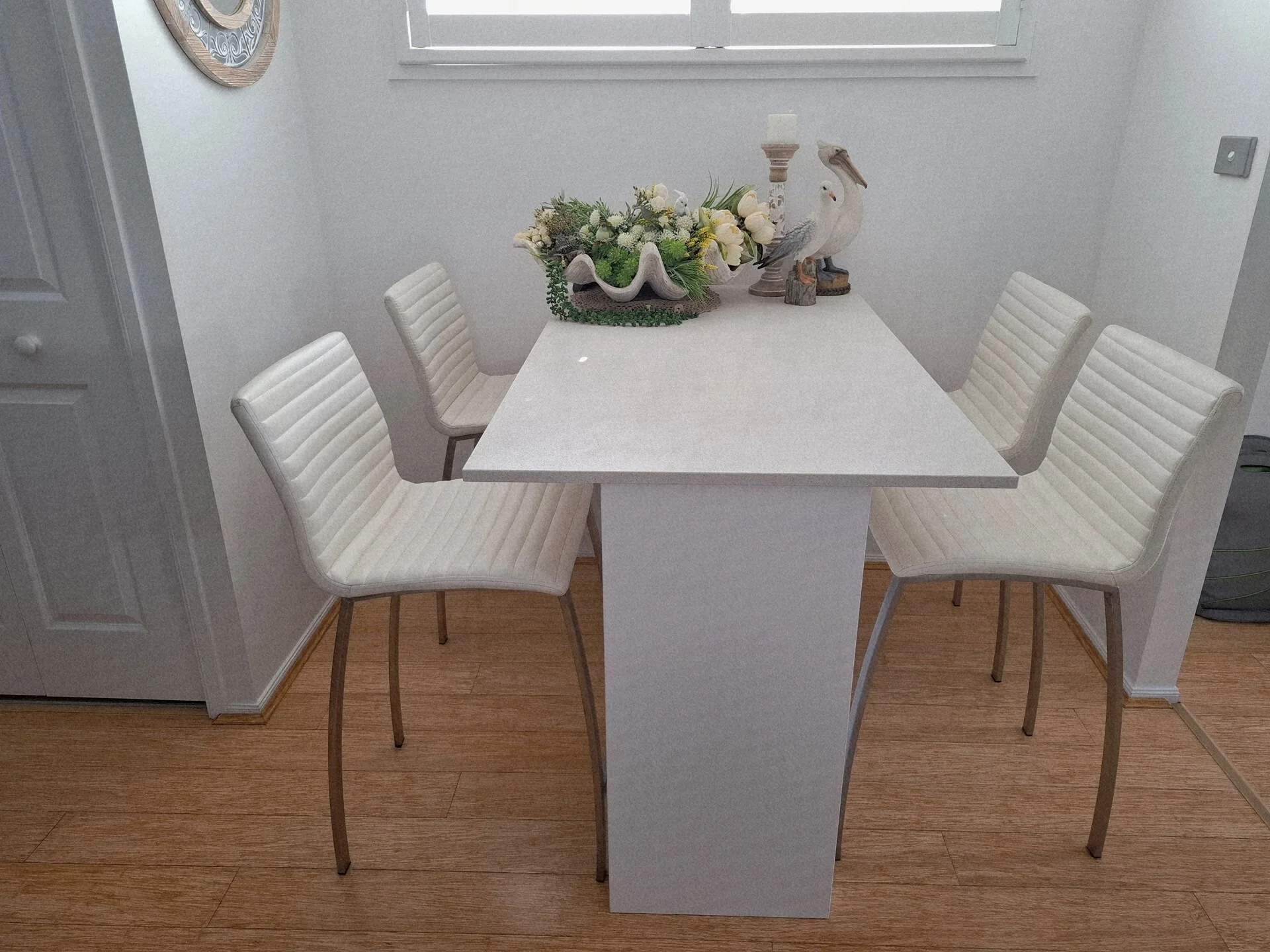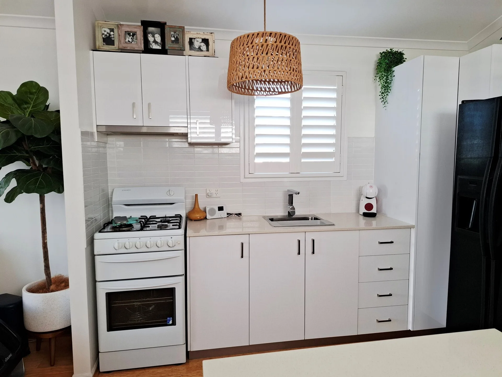 Step inside to find open plan living with timber-look and bamboo flooring, plantation shutters, and a hidden laundry nook for added practicality. The kitchen is well-appointed with gas cooking, stone benchtops, and a built-in stone-top dining table with chairs included. Two air conditioning units and ceiling fans ensure year-round comfort.