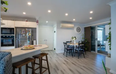 Step inside to discover a light-filled open-plan layout, complete with air conditioning, ceiling fans and timber-look flooring. The modern kitchen includes a dishwasher, while both bedrooms feature built-in robes and carpet underfoot. A separate study offers flexibility as a home office or extra guest room.