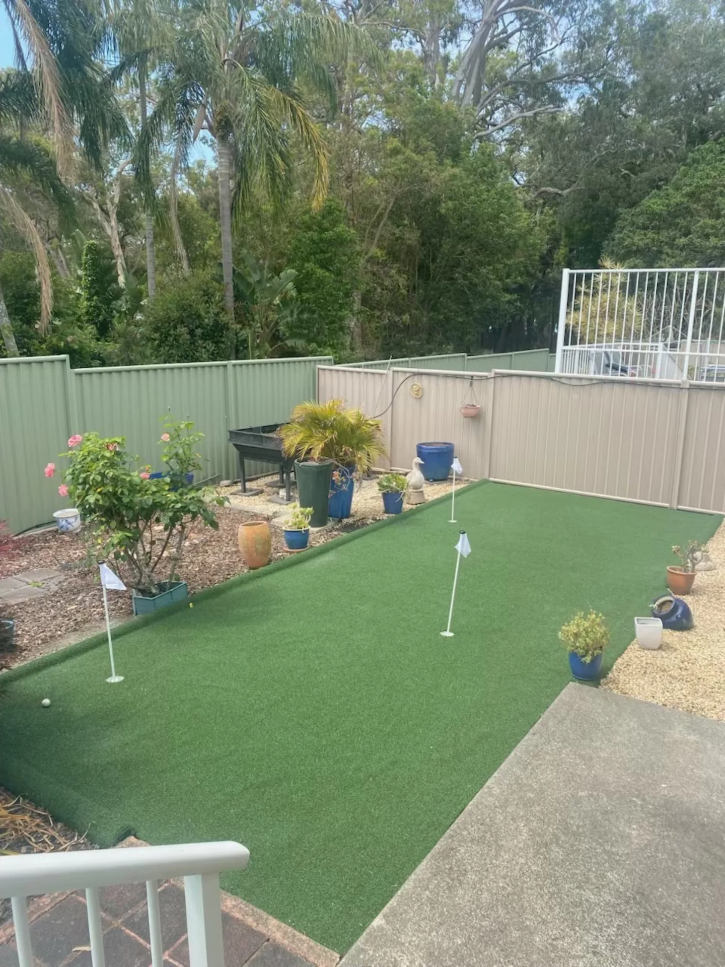 The spacious open-plan layout includes timber-look flooring, ceiling fans, air conditioning, and built-in robes in both bedrooms. The master is impressively oversized – ideal for extra comfort or even a reading nook. The existing second WC offers the perfect opportunity to be extended to include a spacious walk-in shower, easily transforming it into a full second bathroom and adding significant value to the home. A standout feature is the private backyard putting green, perfect for golf lovers or simply enjoying the outdoors.