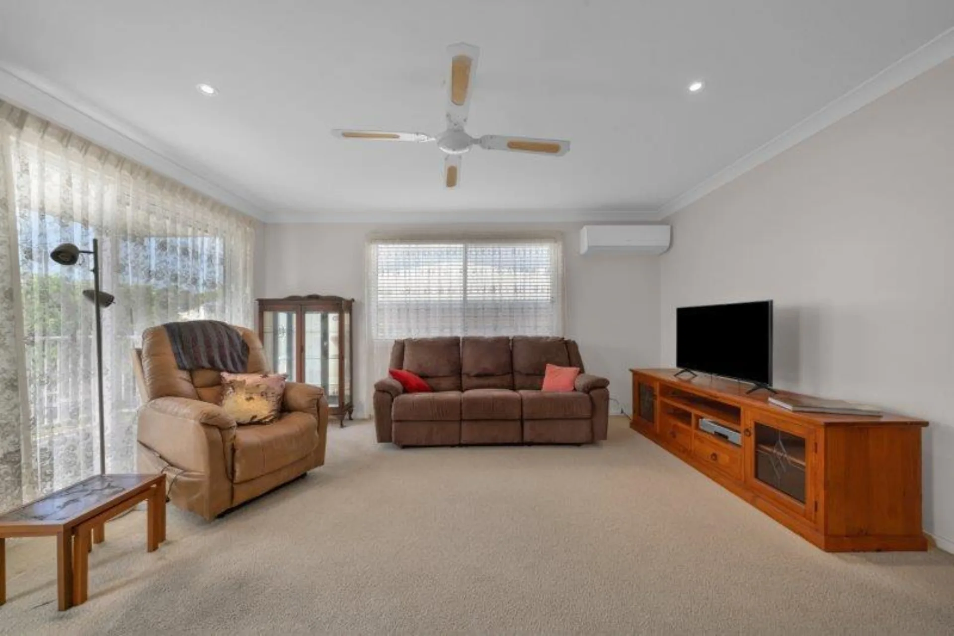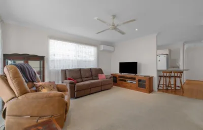 Inside, the home features two bedrooms with built-in robes, plus a separate study – ideal for hobbies, reading or a handy home office. There is a well-appointed bathroom along with two toilets for added convenience when guests visit. Air conditioning and ceiling fans provide year-round comfort, while carpeted bedrooms create a cosy retreat at the end of the day. The kitchen includes a dishwasher, making everyday living that little bit easier.