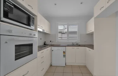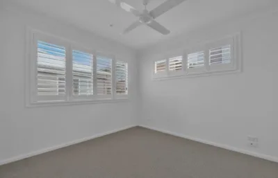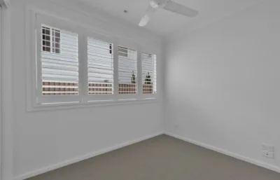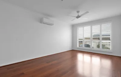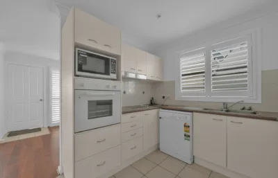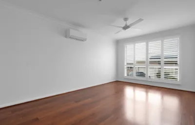 Inside, the home feels fresh and welcoming, with paint and flooring in excellent condition throughout. Timber-look flooring flows through the main living areas, while both bedrooms are comfortably carpeted and include built-in robes for practical storage. Plantation shutters on the front windows add privacy and light control, creating a comfortable space to unwind. Air conditioning and ceiling fans ensure year-round comfort, and the kitchen includes a dishwasher to make everyday living easy.