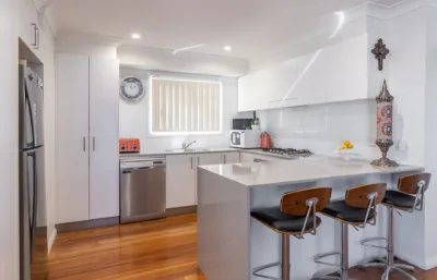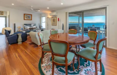 From the moment you step inside, you’ll be drawn to the lake vistas visible from every room. The spacious open plan layout includes two bedrooms (main with walk-in robe and ensuite), a study, and a full-size kitchen with stone benchtops, gas cooking and dishwasher. Hardwood flooring flows through the living areas, while the bedrooms are comfortably carpeted. Year-round comfort is assured with air conditioning and ceiling fans throughout.
