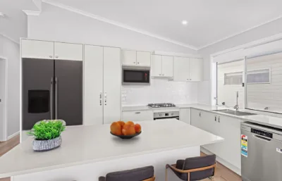The open-plan kitchen, dining and living area is a welcoming space to relax or entertain. Home cooks will love the chef’s kitchen, complete with engineered stone benchtops, Westinghouse gas cooktop and electric oven, Fisher & Paykel dishwasher, and a breakfast bar for casual meals. The home also includes air-conditioning, ceiling fans, and Hamptons-inspired V-groove doors for added style.