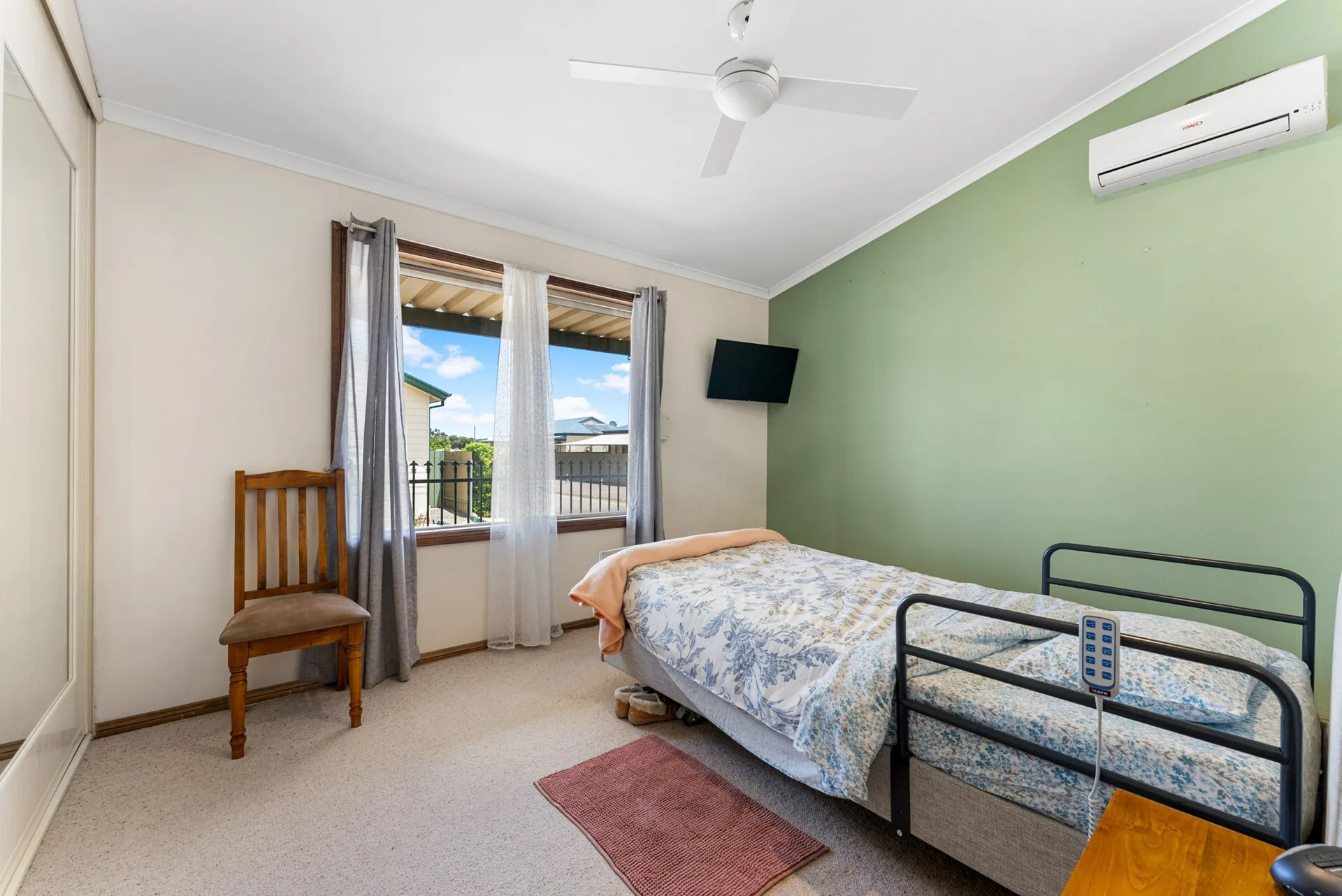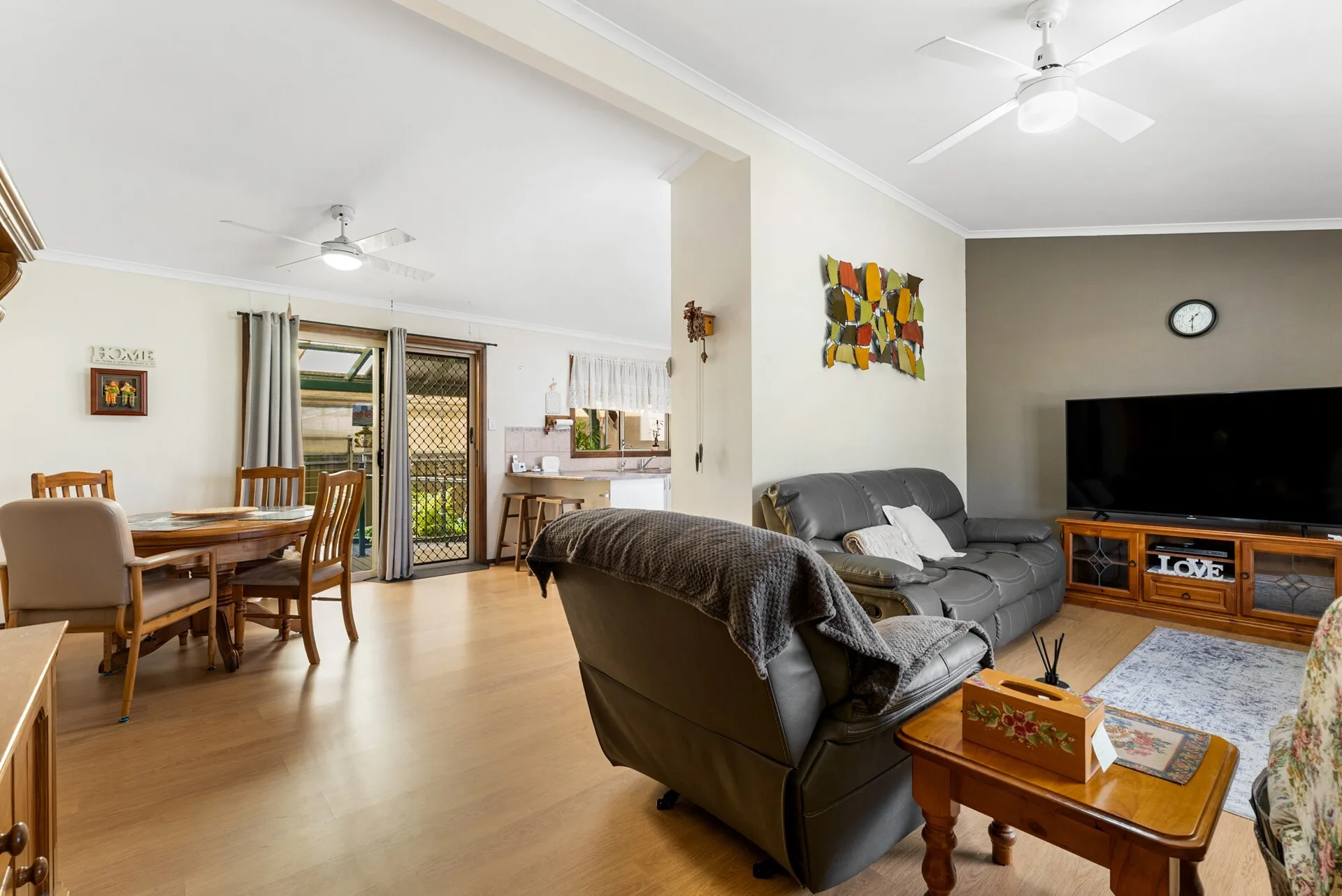 The home features easy ramp access, a secure roller door, and energy-saving solar panels and roller shutters. Inside, the high raked ceilings and floorboards in the main living areas create a bright, airy feel, while fans and a split system air-conditioner keep things comfortable all year round.