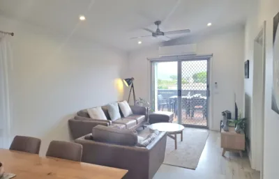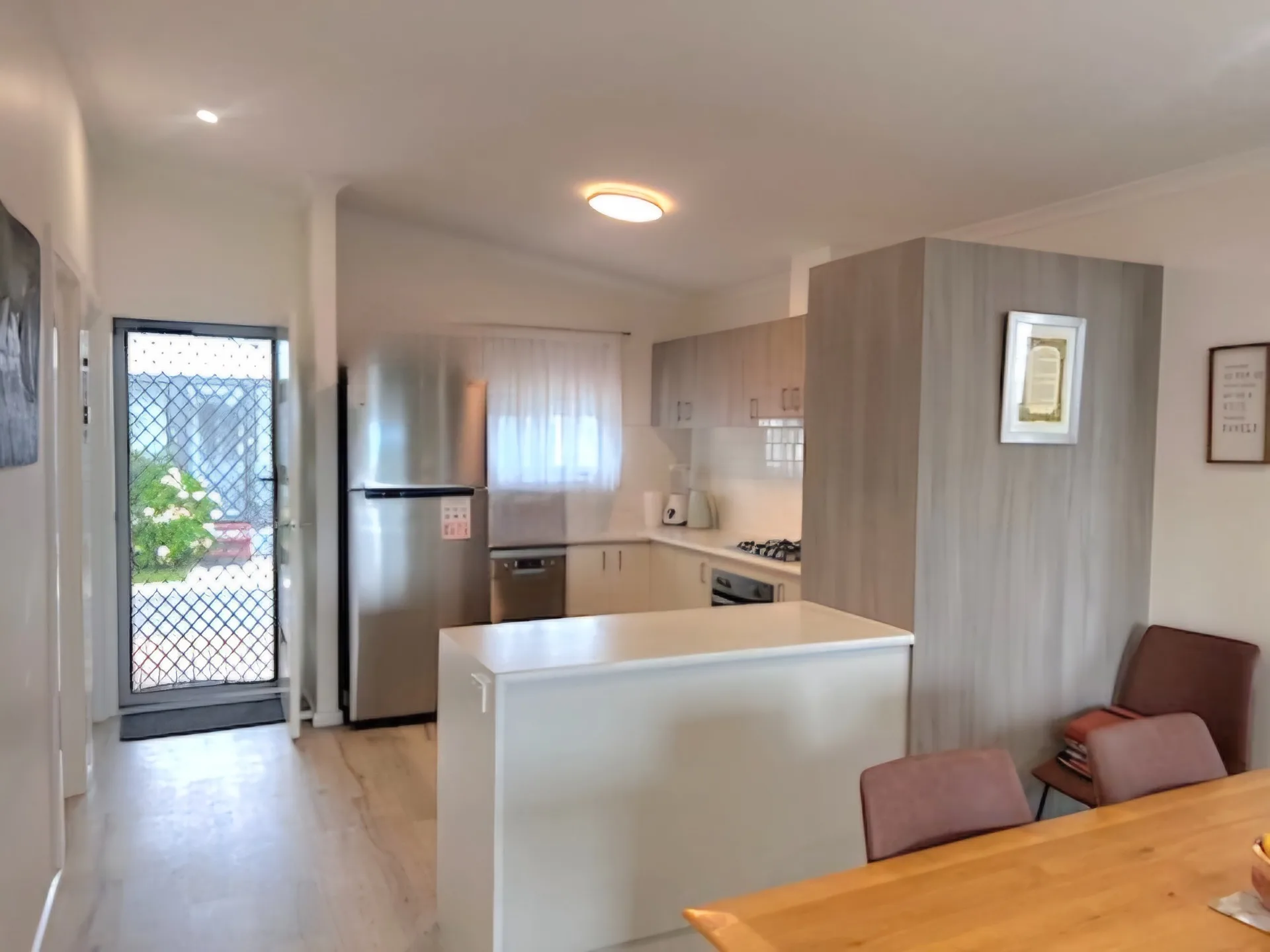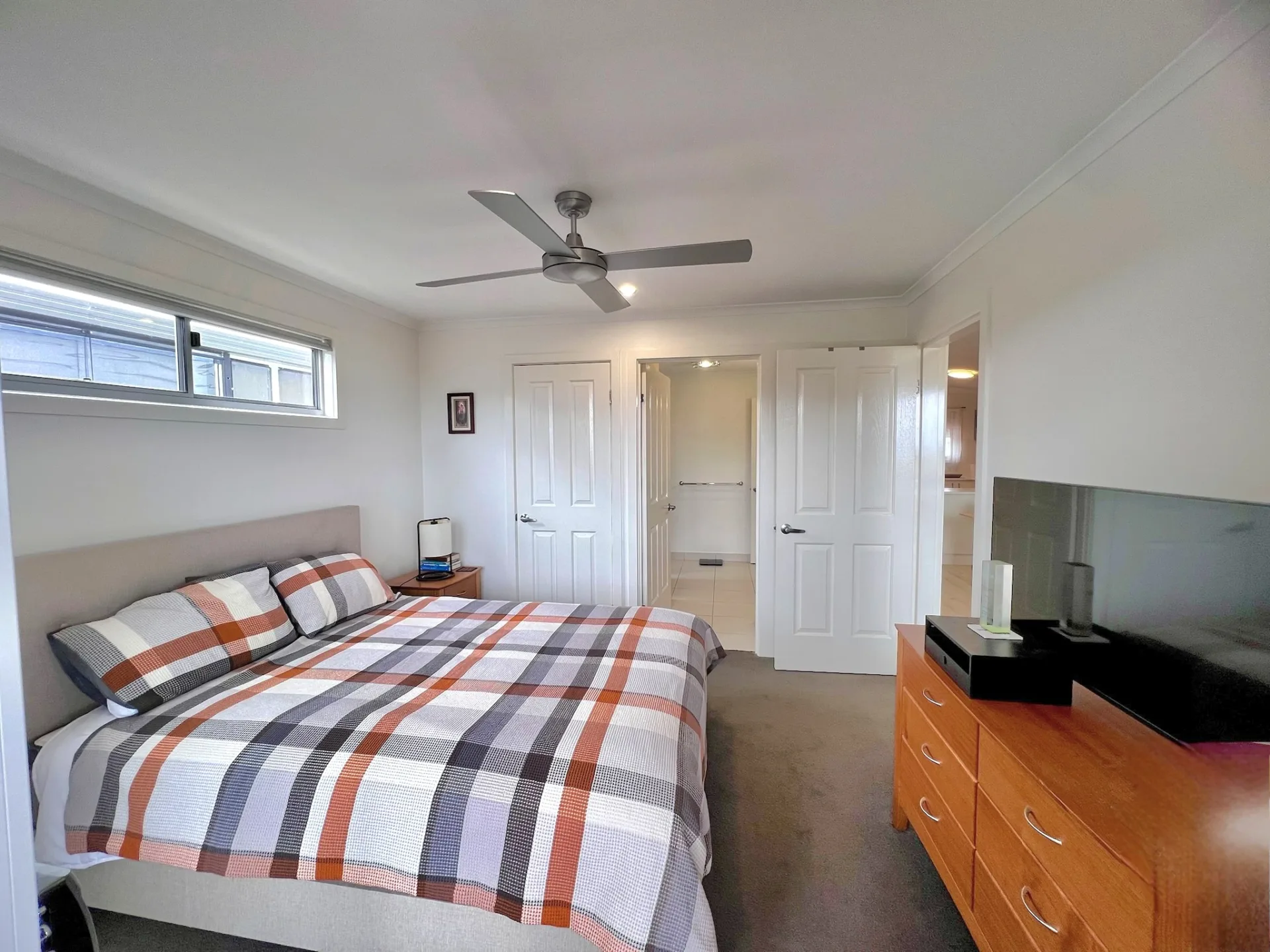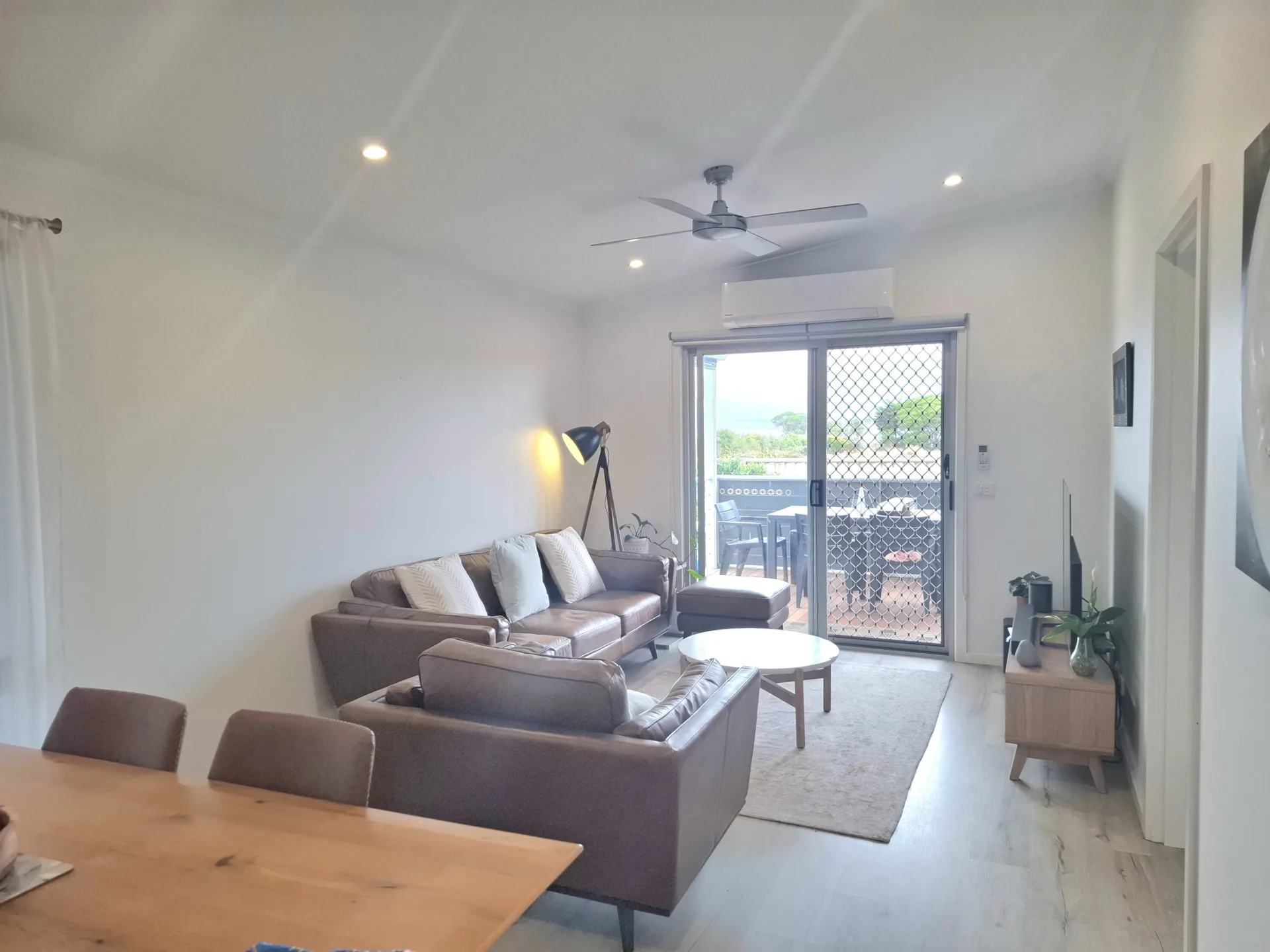 Inside, the sunlit master bedroom features a walk-in robe, generous shelving, and direct deck access—perfect for a morning cuppa with a sea breeze. The stylish bathroom includes dual access and a second separate toilet for added practicality. The second bedroom offers built-in storage and lovely natural light, while the open-plan living area flows effortlessly outdoors via sliding doors. A well-appointed kitchen includes a DeLonghi dishwasher, gas cooktop, and ample storage.