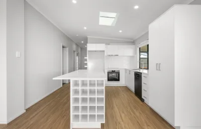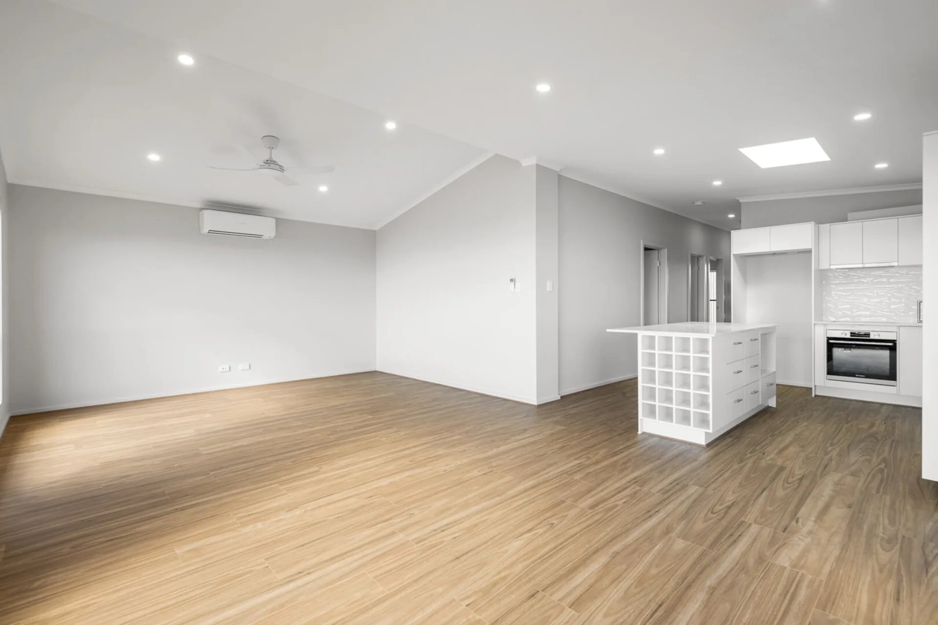 At the heart of the home is a bright, open-plan living, dining, and kitchen area — thoughtfully designed for comfort, connection, and ease of entertaining. The modern kitchen is equipped with an island bench, ample storage, and a quality stainless steel dishwasher, making daily living feel effortless.