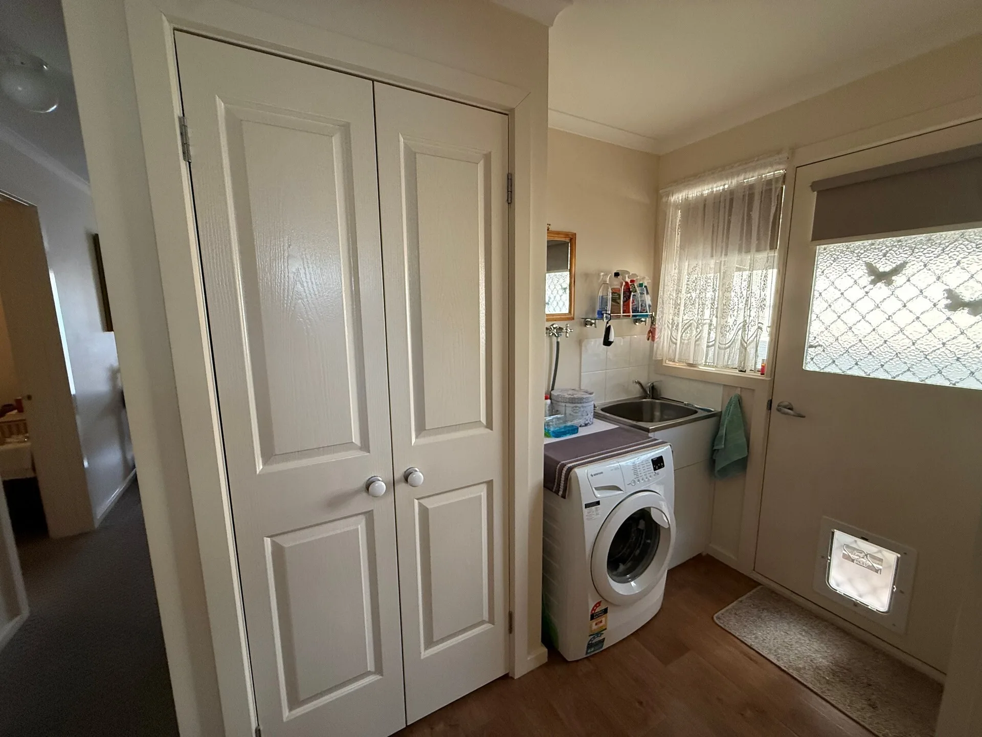 Step inside to find two spacious bedrooms with built-in robes, a versatile study, and a bright, north-facing living area with air conditioning and ceiling fans for year-round comfort. The kitchen features gas cooking and flows easily to the open-plan layout, while timber-look flooring and carpeted bedrooms add a warm, homely feel.